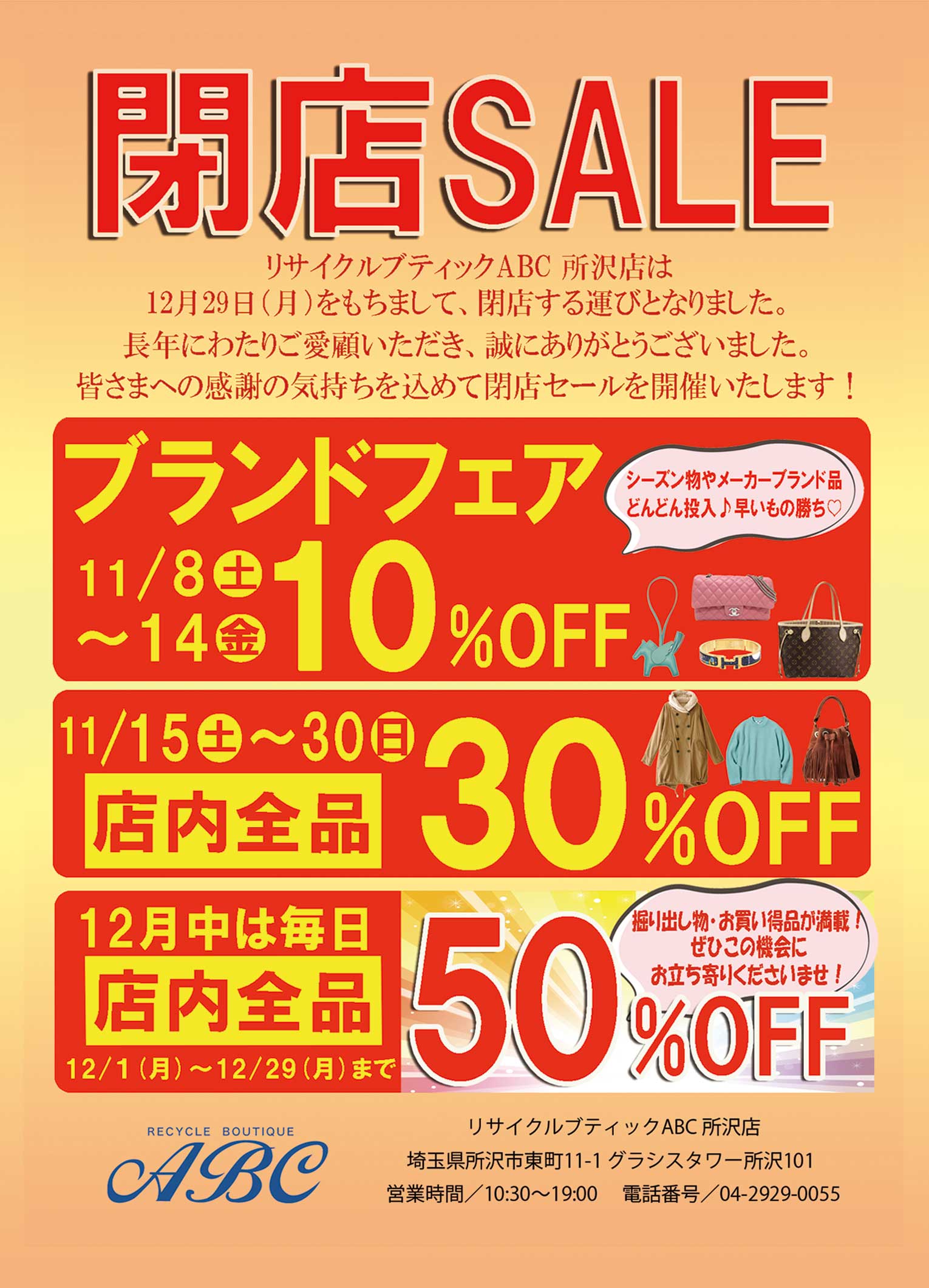 リサイクルブティックABC所沢店は12月29日(月)をもちまして閉店する運びとなりました。17年もの長年にわたりご愛顧いただき誠に有難うございました。皆様の感謝の気持ちを込めまして閉店セールを開催いたします!